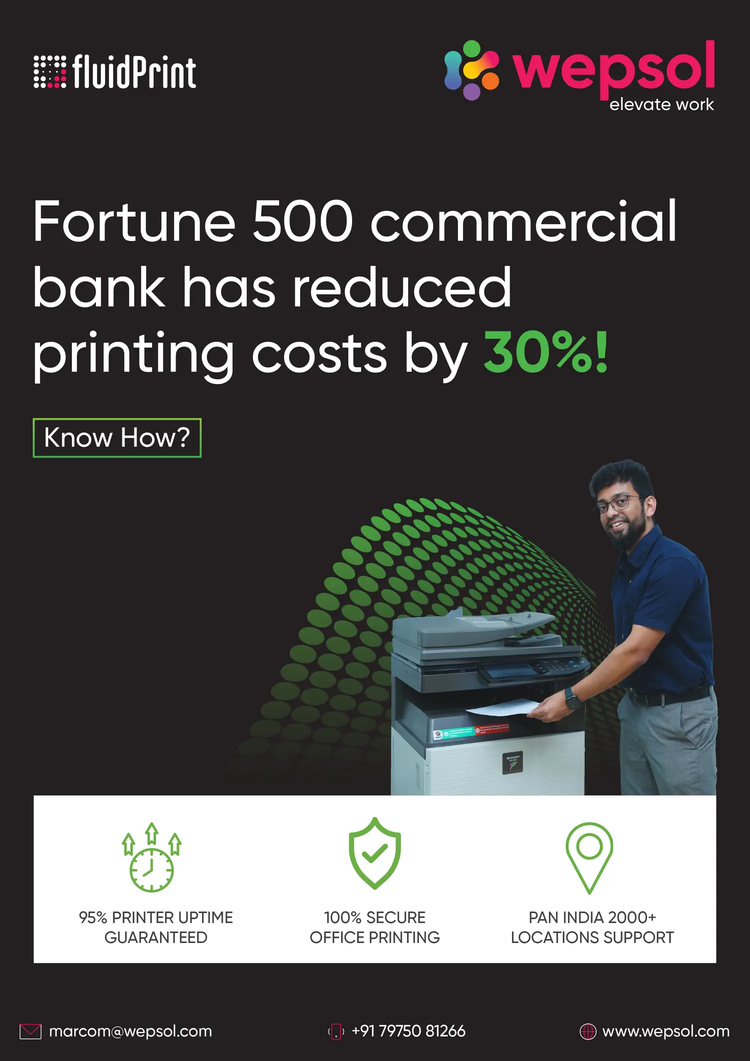 Fortune 500 commercial bank prints 5 crore+ pages annually with 1800+ printers installed across India and reduced the capex spend by 30% with Wepsol Managed Print Services.